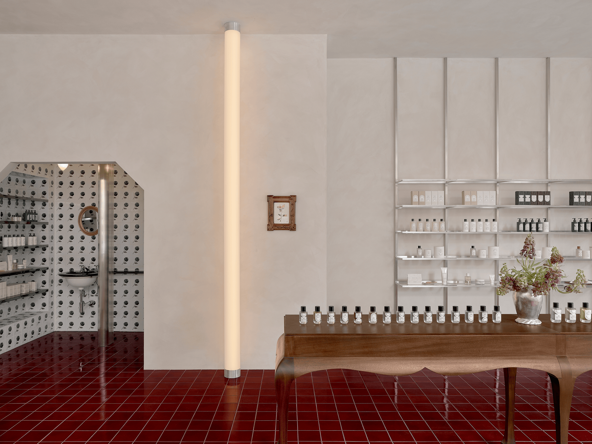 Designed in collaboration with architecture and design studio Charlap Hyman & Herrero, the space reflects both the energy of the city and our approach to reflection and sensory experiences. Limewashed walls and glossy oxblood-tiled floors set the tone, while a tiled niche featuring a hand-painted black rose — a custom artwork by Pilar Almon — anchors the space. Geometric forms and warm, ambient lighting further shape an immersive environment that balances clarity and depth.